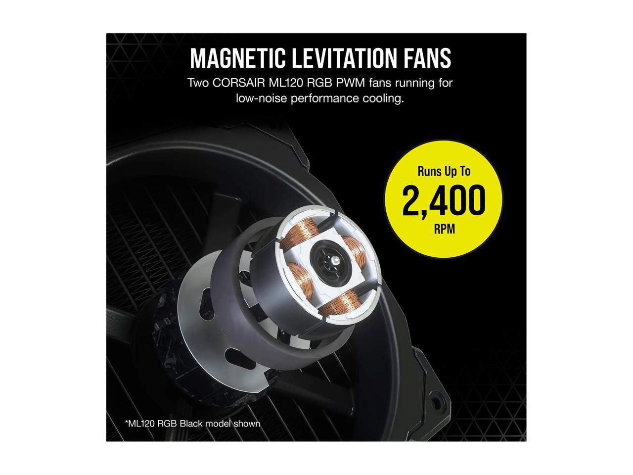 CORSAIR ML RGB Series PWM fans deliver powerful airflow for extreme CPU cooling performance, with eight RGB LEDs per fan. These premium magnetic levitation bearing fans are available for the first time with a beautiful white finish in iCUE ELITE CAPELLIX coolers.