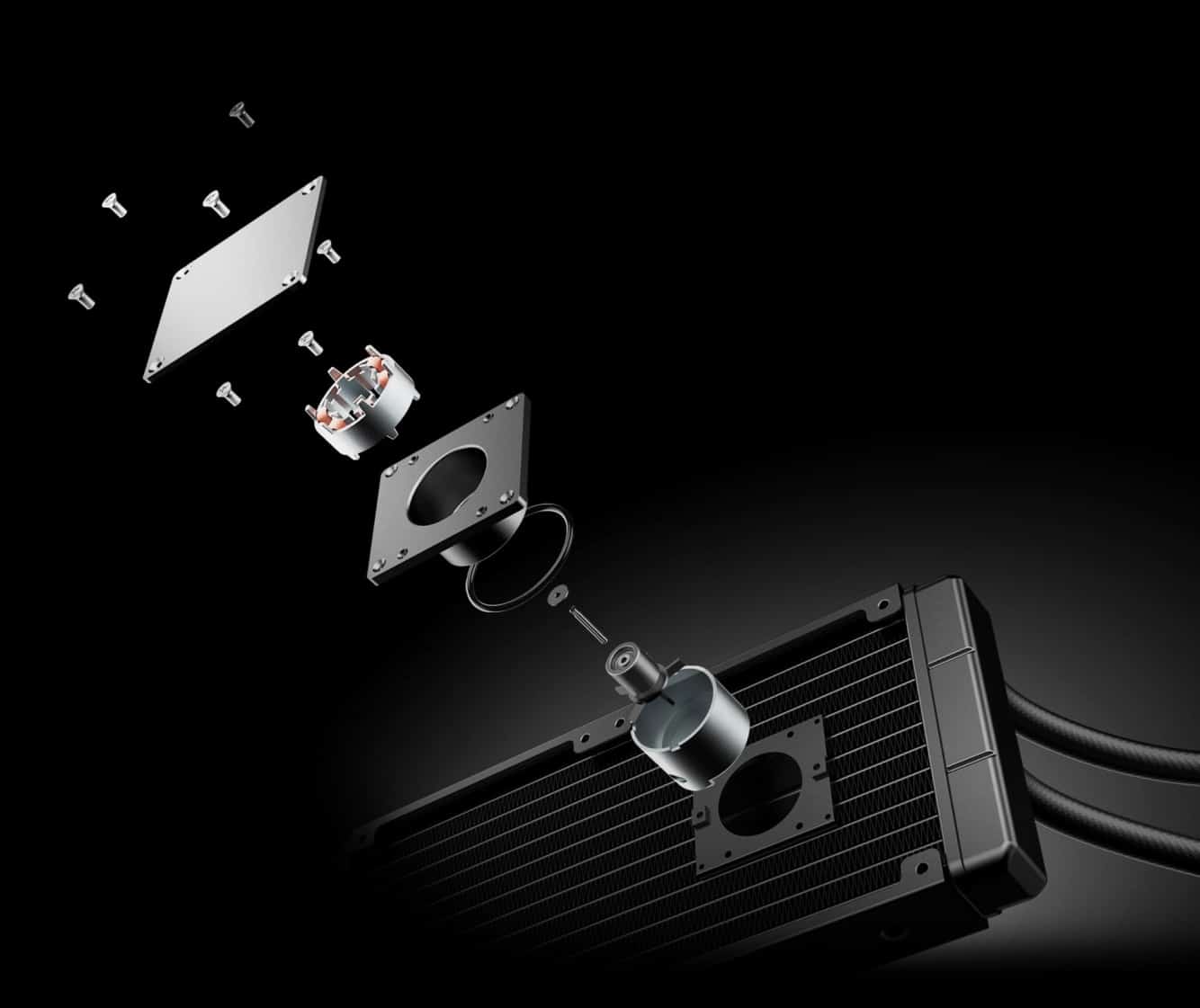 The pump has been integrated into the radiator for sound dampening and noise reduction. Additionally, placing the pump into the radiator also increases the pump’s life expectancy by moving it away from the heat source.