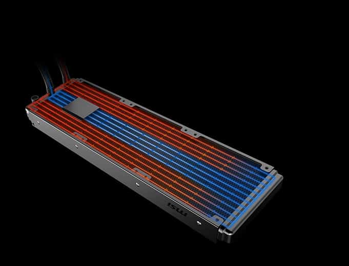 A split pathway through the radiator rapidly dissipates heat, cooled liquid is then pumped back into the loop.