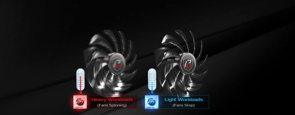 The fan spins when the temperature goes high for the optimal cooling, and stops when the temperature goes low for the complete silence.