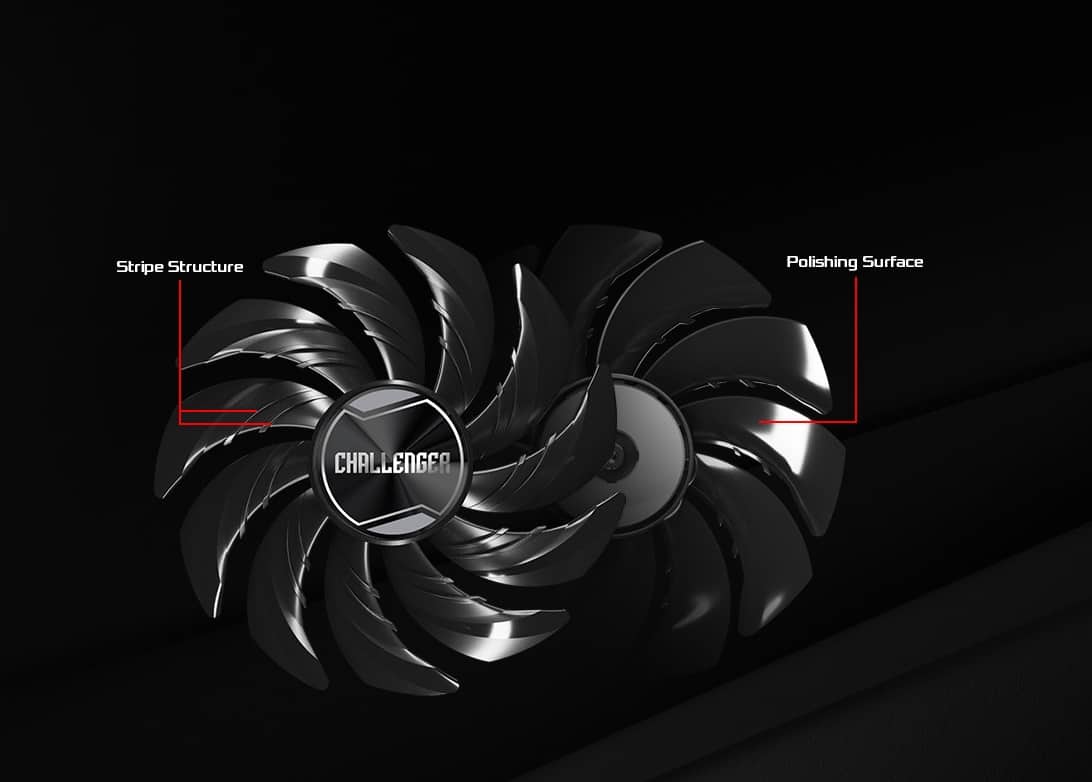 ASRock’s custom Striped Axial Fan delivers enhanced airflow to optimize cooling from not only the stripe structure on each fan blade but also the polishing surface on the bottom side.