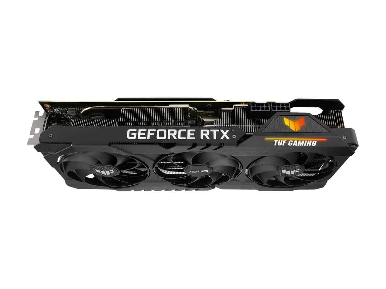 The heat spreader draws heat up into heatpipes that carry it through a fin stack that fills most of the card’s large, 2.7-slot footprint. This generation of TUF Gaming graphics cards also feature a dedicated heatsink for VRAM to keep temperatures well under maximum operating specs.