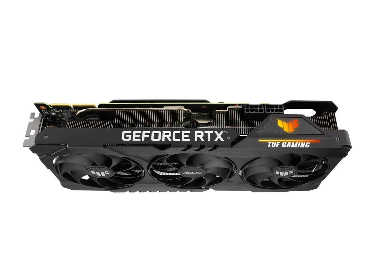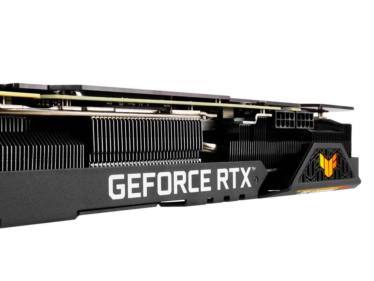 The heat spreader draws heat up into heatpipes that carry it through a fin stack that fills most of the card’s large, 2.7-slot footprint. This generation of TUF Gaming graphics cards also feature a dedicated heatsink for VRAM to keep temperatures well under maximum operating specs.