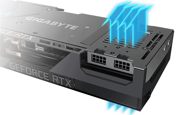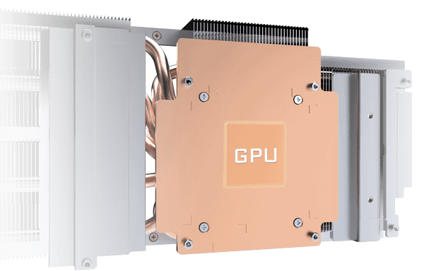 With direct contact to the GPU and VRAM, the large copper plate combines the composite heat pipes to efficiently transfer heat generated from the interior cores to the heat sink.