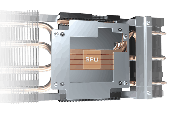 The shape of the pure copper heat pipe maximizes the direct contact area with the GPU. The heat pipe also covers the VRAM through a large metal plate contact to ensure proper cooling.