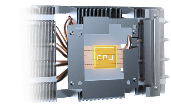 The shape of the pure copper heat pipe maximizes the direct contact area with the GPU. The heat pipe also covers the VRAM through a large metal plate contact to ensure proper cooling.