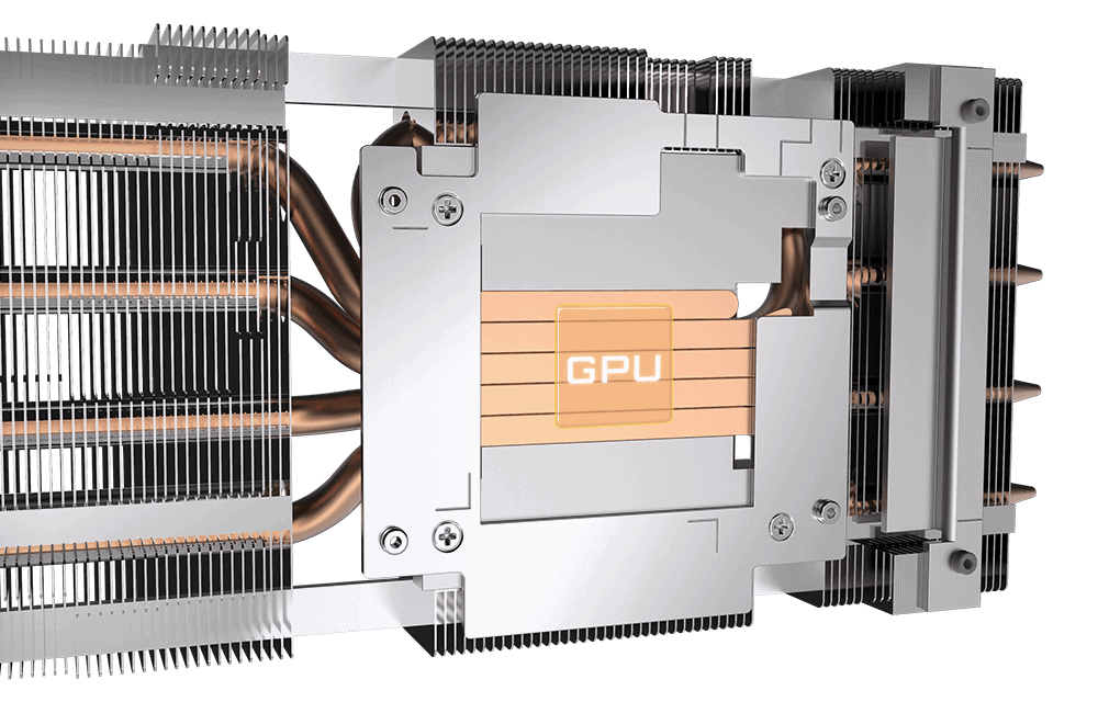 The shape of the pure copper heat pipe maximizes the direct contact area with the GPU. The heat pipe also covers the VRAM through a large metal plate contact to ensure proper cooling.
