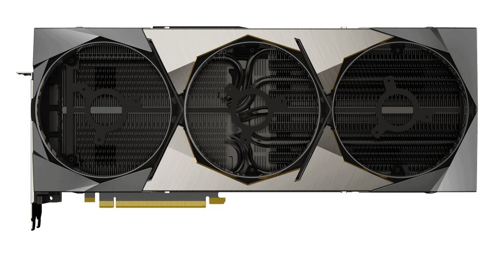 Heat from the GPU is immediately captured by a solid nickel-plated copper baseplate and then rapidly transferred to an array of heatpipes. This widening of the thermal transfer systems with highly efficient mechanisms starting at the base improves overall efficiency.