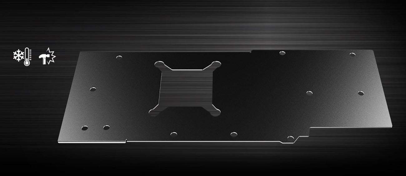 A sturdy brushed aluminum Backplate reinforces the full length of the graphics card while providing passive cooling by applying thermal pads.