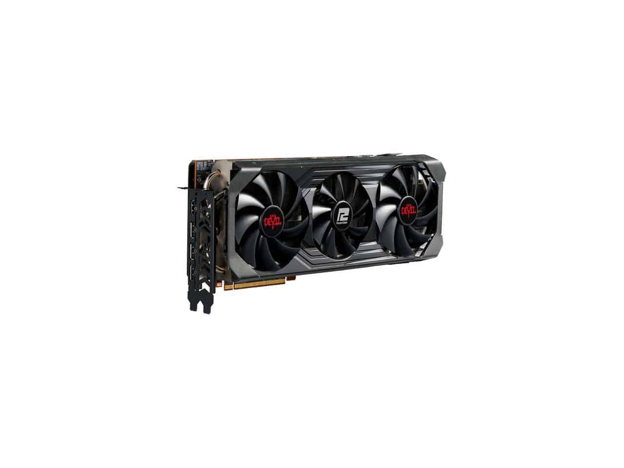 The PowerColor Red Devil RX 6800 XT features a new design with triple fans (100mm x 90mm x 100mm), a 320mm cooler with 7 heatpipes, and a large copper base improves heat transfer and dissipation from the GPU and the VRAMs to provide ultra-efficient cooling. The Red Devil RX 6800 XT is also equipped with a state-of-the-art PCB design utilizing a 14+2 phase VRM with DrMOS, high quality polymer capacitors, and two 8-pin PCI-E connectors will power the PowerColor RX 6800 XT Red Devil.