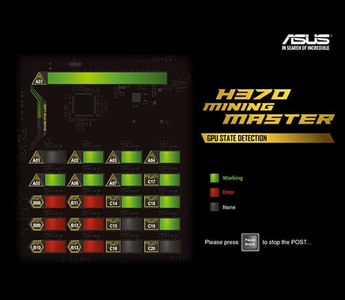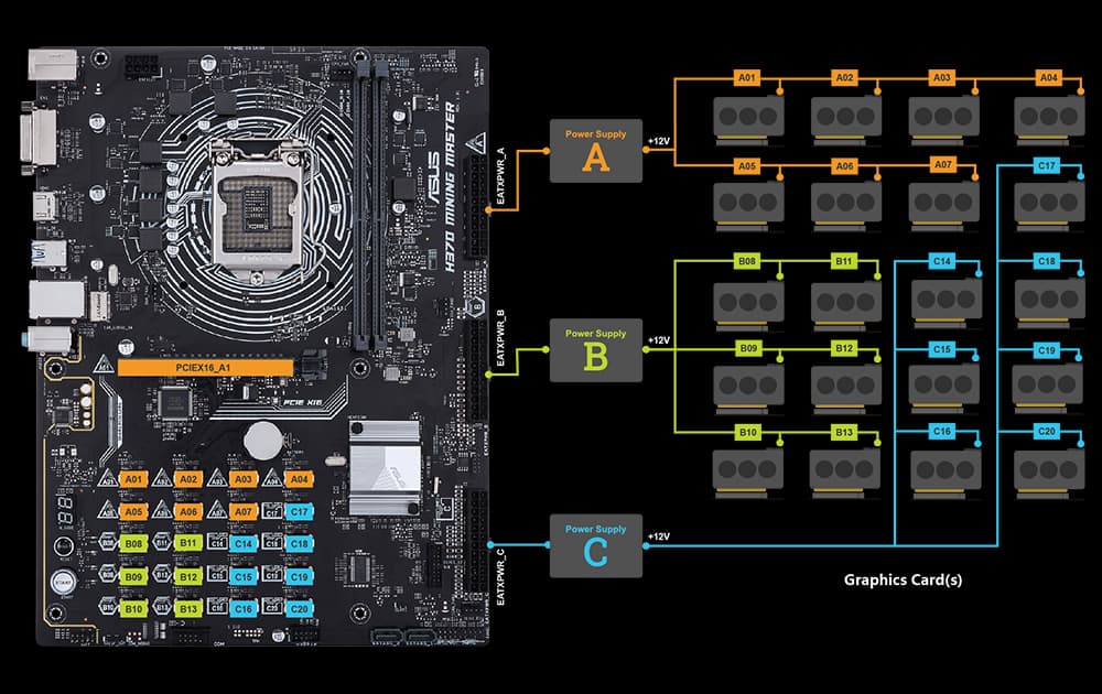 H370 Mining Master is the world’s first mining motherboard that supports up to 20 graphics cards. With 20 PCIe-over-USB ports onboard and triple ATX12V plugs for connecting up to three PSUs simultaneously to power the motherboard, H370 Mining Master lets you run up to 20 NVIDIA and AMD GPUs in parallel to max out the megahash rate.