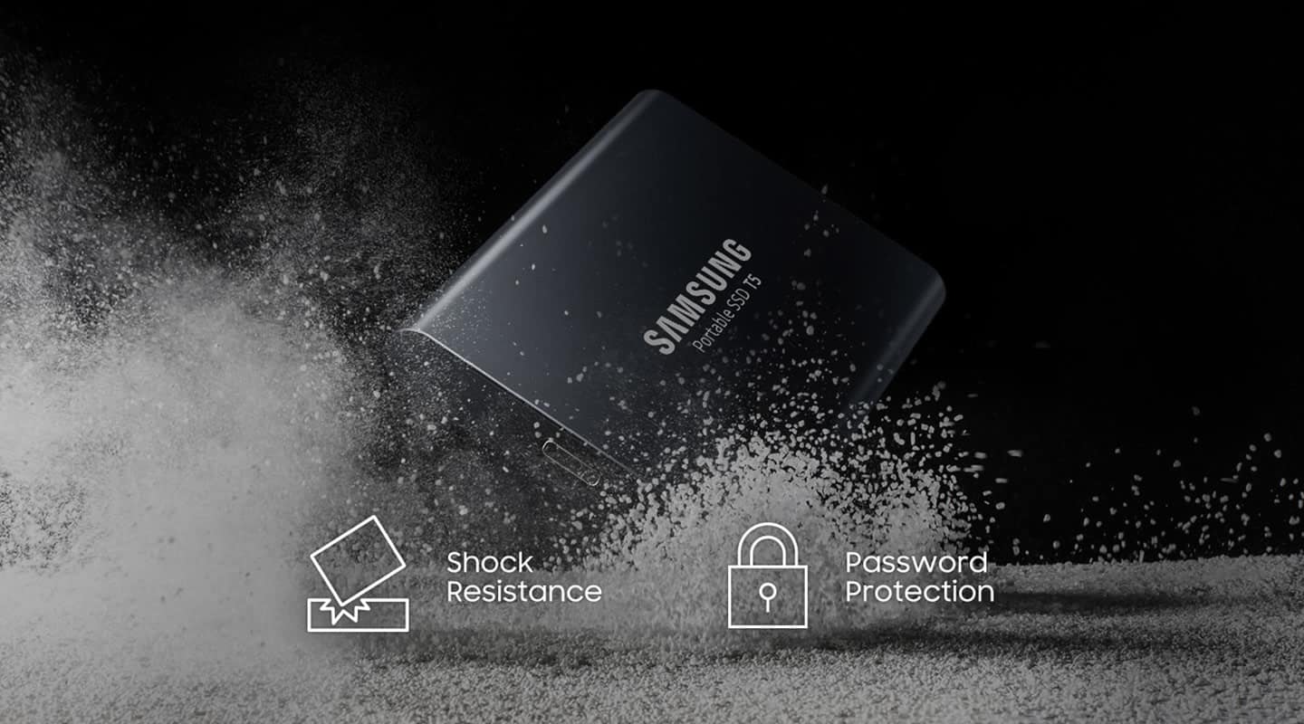 Do more. Worry less. The T5 has no moving parts and a sturdy metal body, so it can handle drops of up to 2 meters*. The optional password protection with AES 256-bit hardware encryption keeps your personal and private data more secure*. It’s all confidently backed by a 3-year limited warranty**.