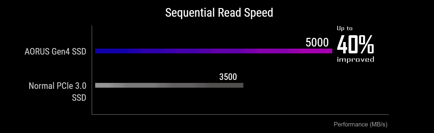 With the new PCIe 4.0 controller, AORUS Gen 4 SSD delivers blazing speeds: up to 5,000 MB/s for sequential read, and up to 2,500MB/s sequential write. Sequential Read performance of PCIe 4.0 SSDs is up to 40% faster than PCIe 3.0 SSDs. Get ready to enter the next generation of computing with faster and smoother, gaming, streaming, and graphics intensive rendering.