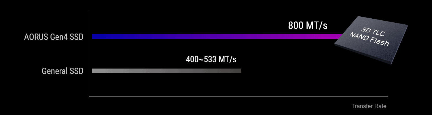 Toshiba BiCS4 NAND Flash optimizes circuitry and architecture by increasing to 96 layers for higher storage space per unit area. 800MT/s throughput on the AORUS NVMe Gen 4 SSD far exceeds that of PCIe 3.0×4 devices for superior storage performance.